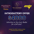 Spotlight 4X Package Step into the rhythm of influence with a powerful, year-long advertising opportunity on **Neo Jazz Radio** — the ultimate destination for lovers of Jazz, R&B, Neo Soul, Spoken Word, Soulful House, and beyond.For a limited time, we’re offering an exclusive **introductory rate of just $4,000 for 12 months** of on-air advertising. That’s a full year of consistent brand exposure to a loyal, culturally engaged, music-driven audience.What You Get for $4,000 (Annual Introductory Package)4 ad airings per selected day2 placements during your chosen morning hour2 placements during your chosen evening hourFixed day-of-week placementOne Social media mention on all Neo Jazz Radio PlatformsAdvantages:✔️ Double-hour visibility. Four strategic placements. Elevated brand positioning.✔️ Because repetition builds recognition — and recognition builds revenue.✔️ Built for frequency, recall, and response.✔️ Brand visibility across multiple genre segments✔️ Access to a loyal and niche audience✔️ Association with a culturally rich, soulful music experienceWhy Neo Jazz Radio? Neo Jazz Radio isn’t just a station — it’s a vibe.Our curated multi-genre format blends:* Smooth and Contemporary Jazz* Classic & Modern R&B* Neo Soul grooves* Soulful House rhythms* Powerful Spoken Word* Emerging independent artistsThis dynamic mix attracts discerning listeners who value artistry, culture, lifestyle, and premium experiences — making it the perfect platform for brands that want meaningful engagement.Instead of paying high monthly ad rates elsewhere, lock in an entire year of exposure for one powerful investment.If your audience appreciates authenticity, creativity, and culture — they’re listening to Neo Jazz Radio.Why Act Now?This is a **limited introductory offer** designed to welcome founding advertising partners. Rates will increase as the station grows — and we are growing.Secure your spot. Amplify your brand. Align with the sound of sophistication.Financing Options Available with Flexxbuy!**Neo Jazz Radio — Where Culture, Soul, and Sound Connect.**This is New... Not Boring Radio!